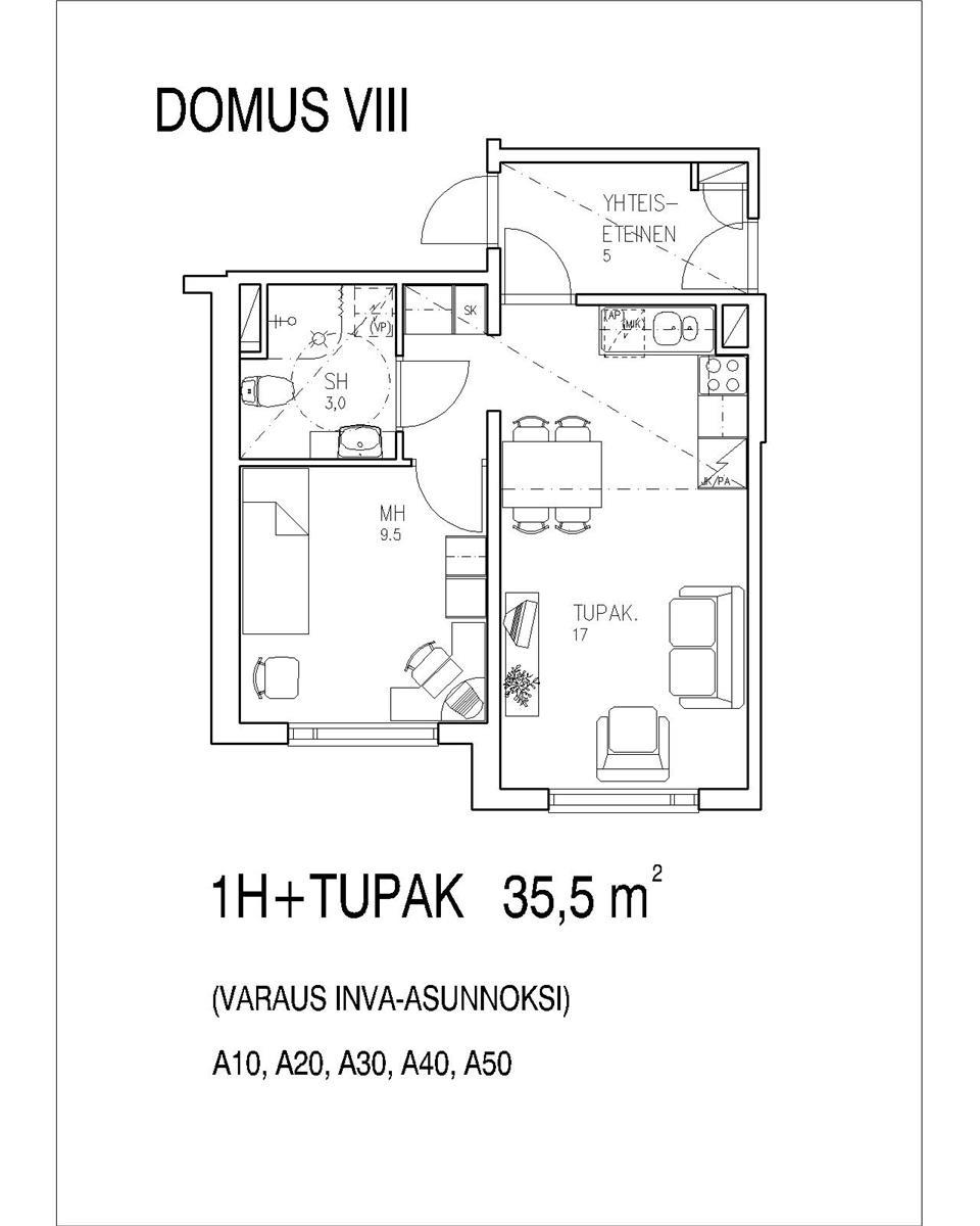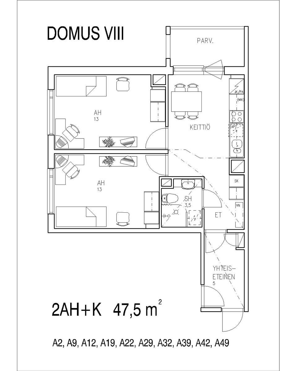 Parveke: pohjakerroksessa vain asunnoissa 2 ja 3. Muissa kerroksissa parveke on kaikissa muissa asunnoissa paitsi seuraavissa 33,5 m2 ja 35,5 m2 yksiöissä: 11, 20, 21, 30, 31, 40, 41 ja 50