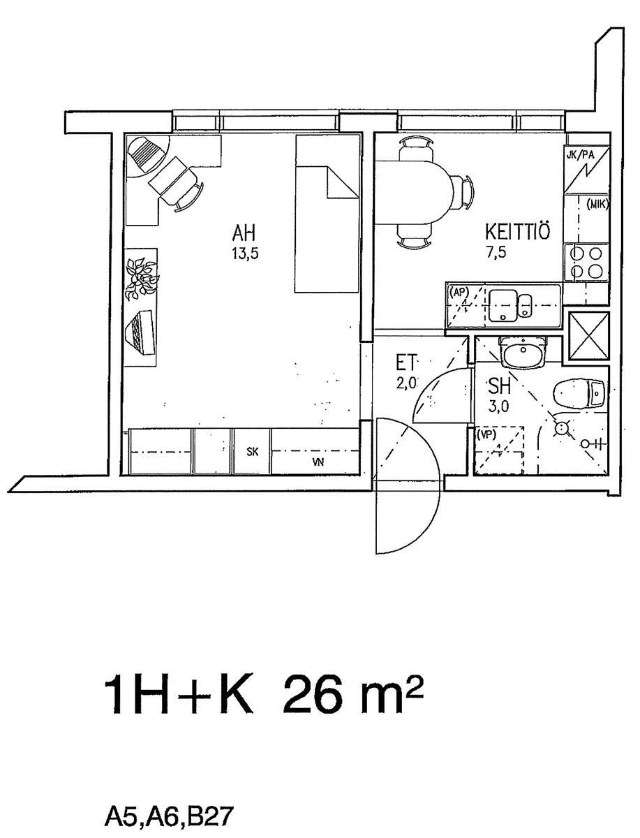 Parveke vain kaksioissa ja pohjakerroksen yksiöissä as nro A 4 ja B 28