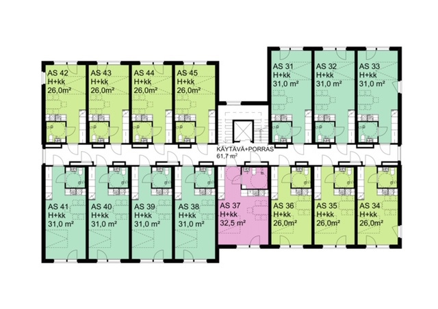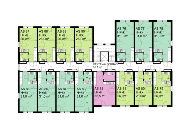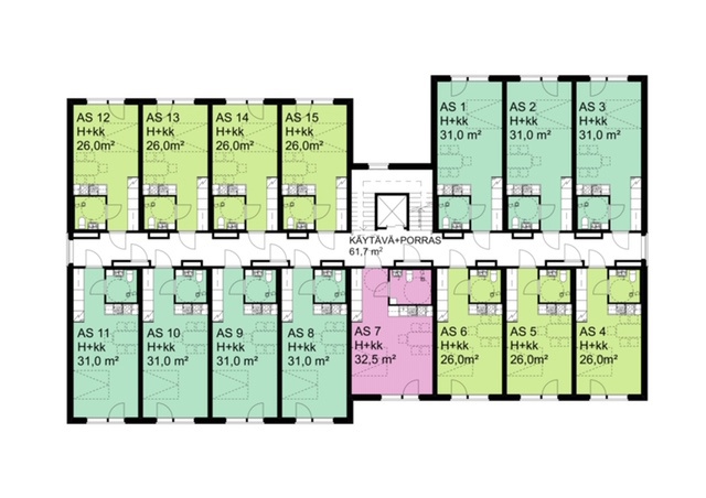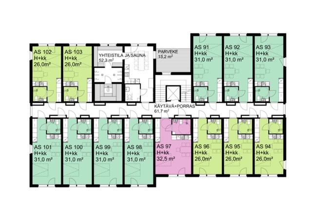 - Talon pohjakerroksessa yhteistilat ja pesula (5 pesukonetta ja 5 kuivuria), asunnoissa ei ole pyykinpesukoneliitäntää