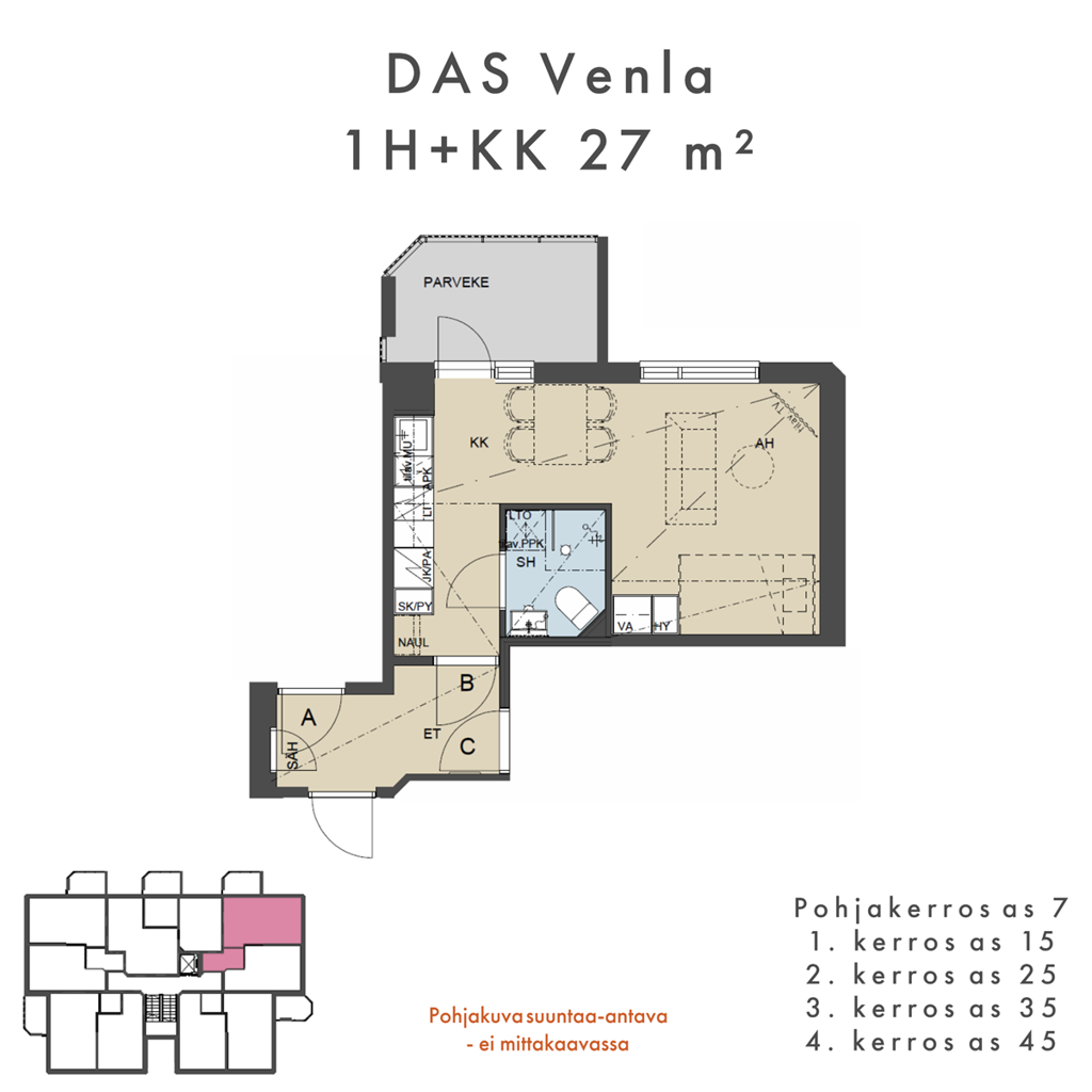 1 h+kk    (26,5 m²) 392,20 €/ kk                         käyttömaksu 23 €/kk