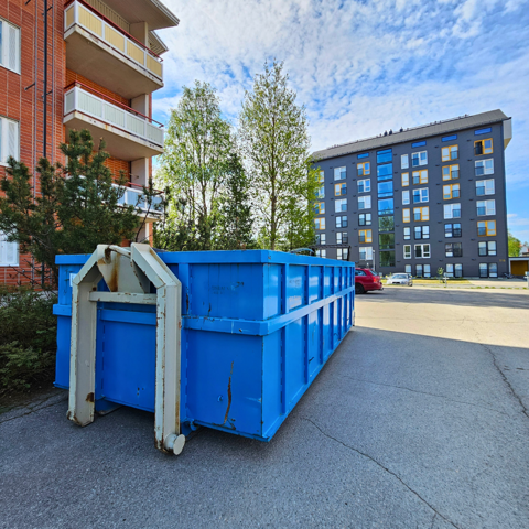 Vaihtolavat on tuotu talojen pihalle helpottamaan poismuuttoa ja ylimääräisten/rikkinäis...